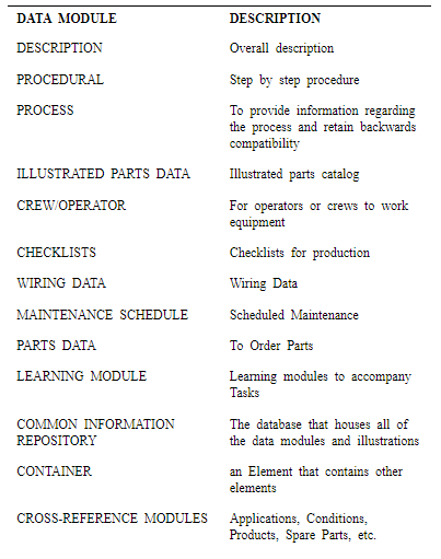 S1000D is an international specification for technical publications for the procurement and production of technical publications for aerospace, defense and capital-intensive equipment applications. The S1000D group combined the requirements for the maintenance and operations document into a common source. They utilized the existing XML to create specified elements and attributes for procedures and processes. This is the origin for the data module types used today.