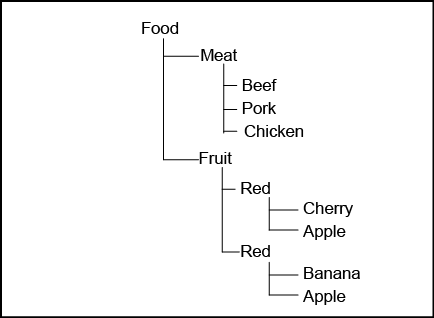 Common Source Data Base is a structure for data more like a map or a tree. In this structure, “Food” is called the “parent”. “Meat” and “Fruit” are called the “child”. And in a data base, a numerical id would be assigned to each “node”. Databases are used when there is a lot of data so that when it is populated with all the data someone can query the database to display only the information they need to see.