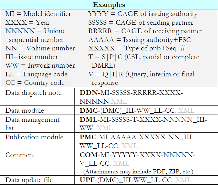 In the old days this was the document name. In S1000D it is the Technical Manual Identification Number (TMIN). The identification number has a specific format. We will discuss the naming conventions for the TMIN in detail later, but here are some examples.